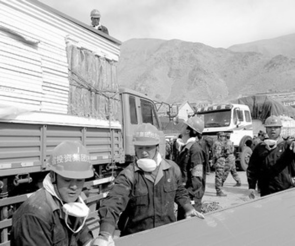 按计划,4月17日共有棉帐篷23050顶、棉大衣11000件、棉被16000床、野战食品100000份、方便食品250吨、应急灯200盏、行军床50张、毛毯50条运抵玉树。