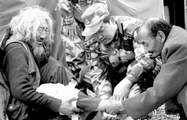 4月20日,公安边防部队医疗救援队医护人员在为地震中受伤的藏族老人扎西德勒包扎伤口。 当日,公安边防部队医疗救援队深入玉树结古镇红卫村重灾区进行巡诊。在为灾区群众看病治病过程中,突降小颗粒冰雹,官兵们不顾寒冷,继续给当地群众诊病治疗。 王小雪摄(新华社发)