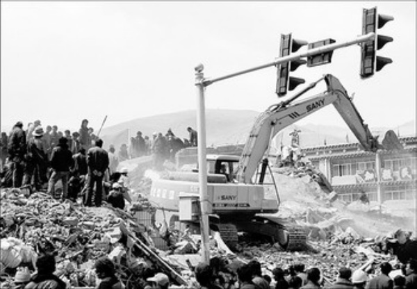 | 4月19日,大型机械设备在玉树地震灾区进行清理工作。 |