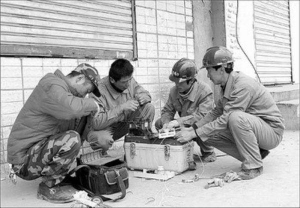 | 4月20日,玉树县结古镇街头,通讯人员正在紧急抢修通讯线路。 |