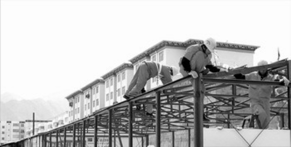 | 4月20日,三一重工集团的抢修人员正在卫生医疗救助点紧急搭建又一批医疗救助板房。 |