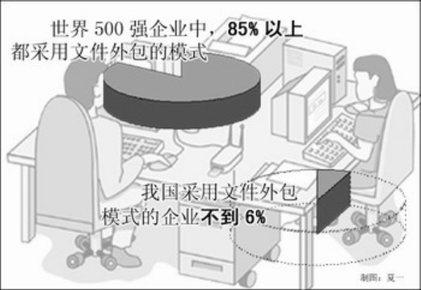池燕明告诉记者,世界500强企业中,85%以上都采用文件外包的模式,这样既提高了处理效率又降低了成本。在国内,采用文件外包模式的企业不到6%。这个发展空间是巨大的。