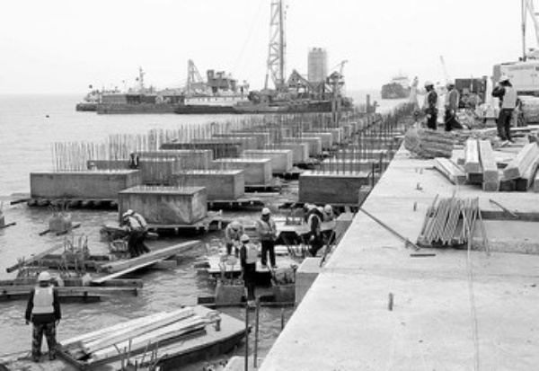 4月21日,工人们在河北黄骅港紧张施工。 作为中国第二大煤炭输出港的黄骅港将“变身”为综合大港。预计2010年8月,通航能力达到10万吨级的4个通用散杂货泊位将启用,黄骅综合大港将正式通航。 新华社记者 巩志宏摄