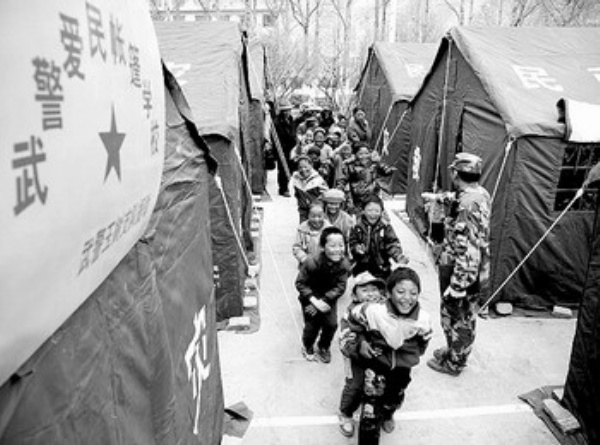 4月20日早晨,天刚亮,8岁的藏族小姑娘代来巴毛与小伙伴手挽着手,一起来到武警青海总队玉树支队在灾区开设的首座武警爱民帐篷学校。