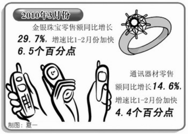 3月份,金银珠宝零售额同比增长29.7%,增速比1—2月份加快6.5个百分点。在3G手机热销的带动下,通讯器材零售额同比增长14.6%,增速比1—2月份加快4.4个百分点,创下2008年10月以来的最快增速。