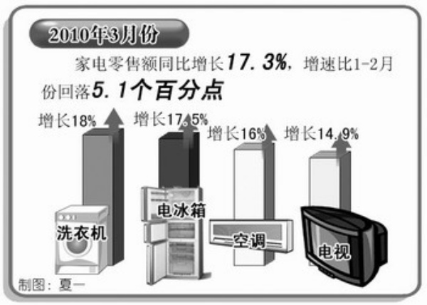 3月份,家电零售额同比增长17.3%,增速比1—2月份回落5.1个百分点。洗衣机、电冰箱、空调、电视机零售额同比分别增长18%、17.5%、16%和14.9%。