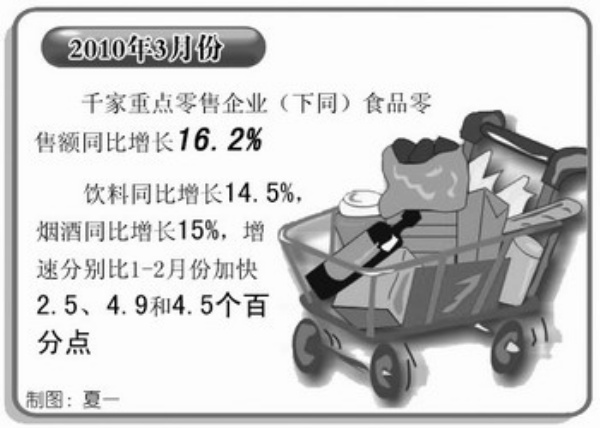 3月份,千家重点零售企业(下同)食品零售额同比增长16.2%,饮料同比增长14.5%,烟酒同比增长15%,增速分别比1—2月份加快2.5、4.9和4.5个百分点。