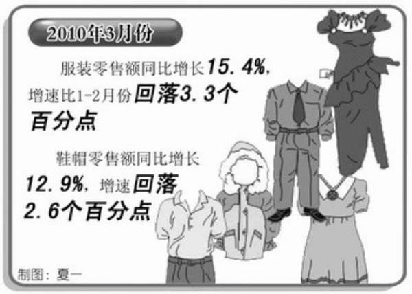 3月份,服装零售额同比增长15.4%,增速比1—2月份回落3.3个百分点;鞋帽零售额同比增长12.9%,增速回落2.6个百分点。