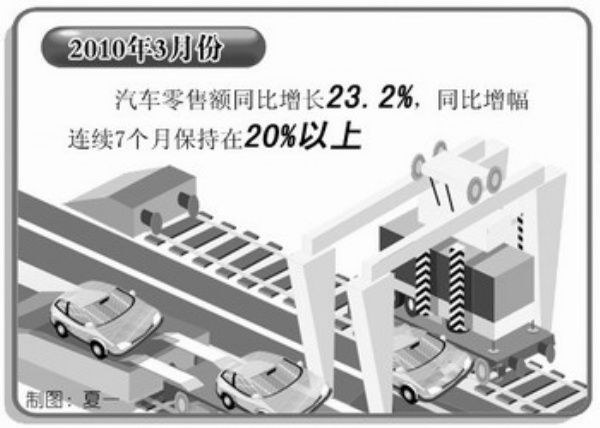 汽车市场延续2009年以来的旺销态势,3月份零售额同比增长23.2%,同比增幅连续7个月保持在20%以上。