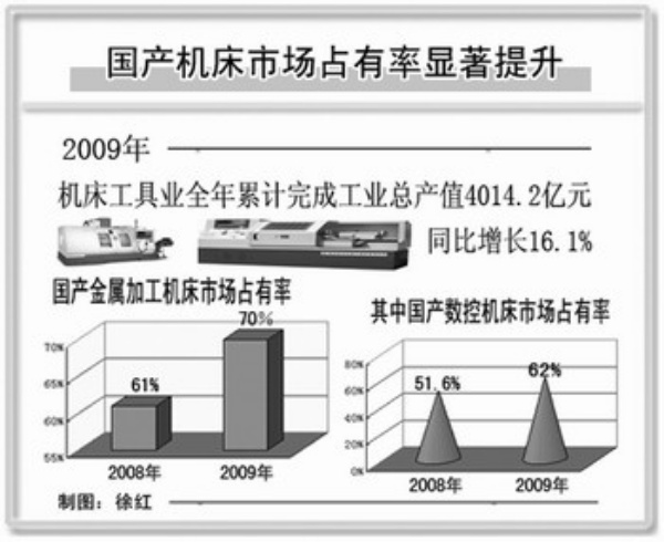 据工业和信息化部装备工业司司长张相木介绍,2009年,中国机床工具行业全年累计完成工业总产值4014.2亿元,同比增长16.1%。国产机床市场占有率显著提升,国产金属加工机床产值市场占有率由上年的61%提高到70%,其中国产数控机床由51.6%提高到62%。