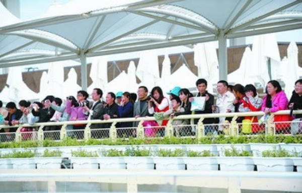 4月25日,上海世博园内,观众兴致勃勃游览特色场馆。当天,上海世博会迎来第五场试运行。游客人数从24日的30万增加到近40万,是目前为止观众人数最多的一次“大客流”测试。 本报记者