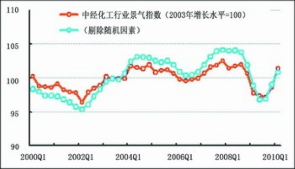 即使在进一步剔除随机因素后,2010年一季度石油行业生产合成指数和化工行业生产合成指数均比上季度有所上升(见中经石油行业生产合成指数及中经化工行业生产合成指数走势图中的蓝色曲线),这说明我国石化产业主要产品产量已实现全面增长,行业内企业的生产积极性已经恢复。