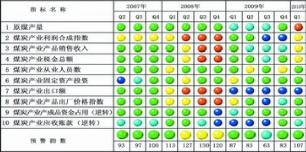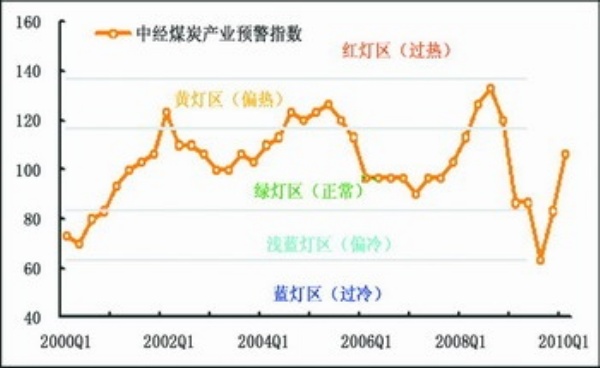 预警:2010年一季度,中经煤炭产业预警指数为106.7点,较上季度增加23.4点,在“绿灯区”内强劲反弹,且继续向上运行。这主要是因为煤炭产业成本下降,需求增加,煤炭产品出厂价格大幅上升,且企业销售增加,盈利增多。