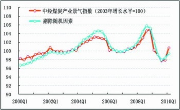 需要说明的是,在进一步剔除随机因素后,中经煤炭产业景气指数比未剔除随机因素时低1.3点(见中经煤炭产业景气走势图中的蓝色曲线),且两条曲线出现了较为明显的差别。这表明,2010年一季度我国煤炭产业景气度的大幅提升,主要是依靠国家政策支持,产业内在发展动力仍显不足。