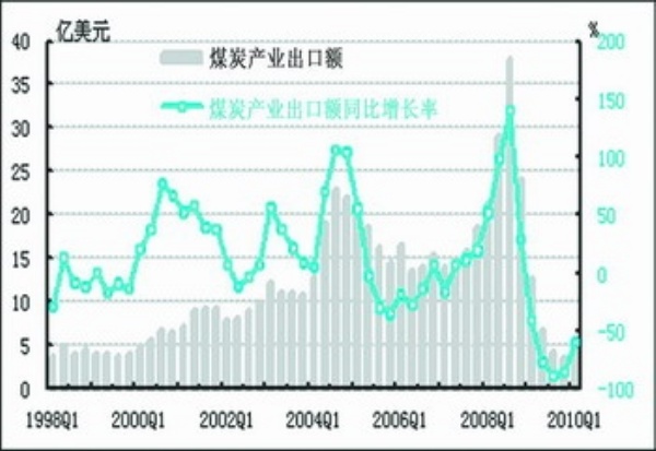 一季度,煤炭产业出口额仅占产品销售收入的0.68%,而在2006年至2008年间,该比重的平均值约为5.4%。这表明目前出口对煤炭产业的贡献度偏低。