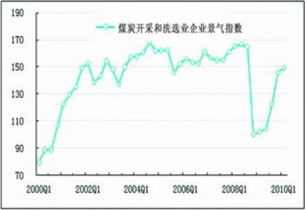 景气:2010年一季度,中经煤炭产业①景气指数为100.7点(2003年增长水平=100②),比上季度上升2.6点,继续保持强劲反弹的走势。