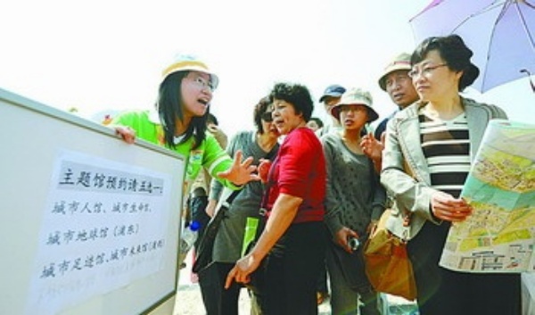 ▲5月1日,上海世博园区志愿者在为游客提供预约使用指导服务。