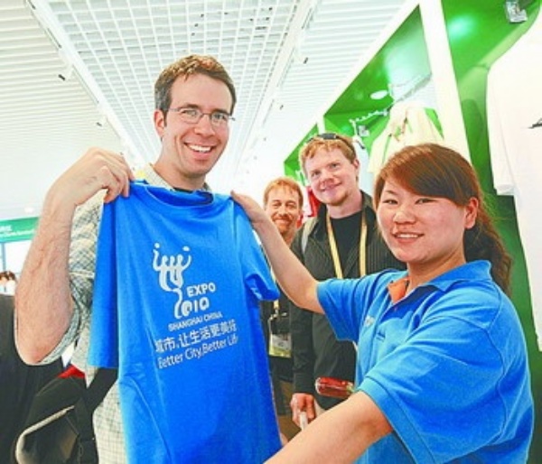 ▲随着上海世博会正式开园,世博特许商品中的纪念章、毛绒玩具、T恤等受到欢迎。