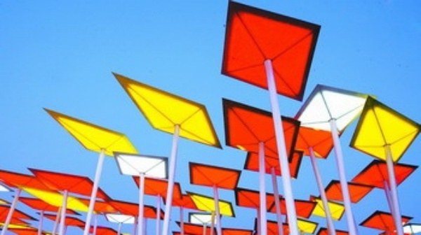 这是4月28日拍摄的墨西哥馆夜色中的“风筝林”。当日,墨西哥国家馆开启景观灯,124只“风筝”组成的“风筝林”蔚为壮观。 新华社记者 裴 鑫摄