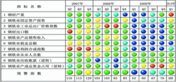 预警:2010年一季度,中经钢铁产业预警指数为103.3点,比上季度大幅上升33.3点,目前已运行于“绿灯区”中心线以上。