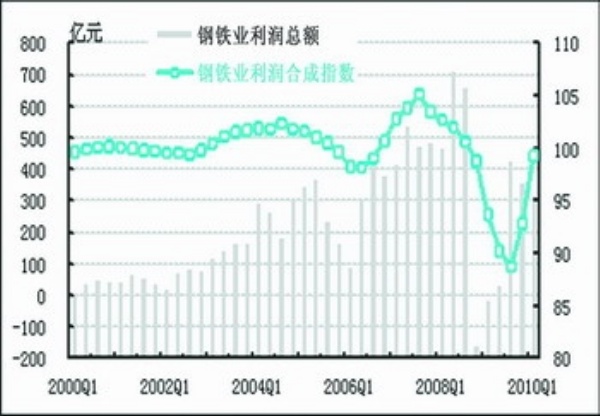 亏损:经初步季节调整,2010年一季度,钢铁产业企业亏损额为71.4亿元,同比下降68.9%,同比增速较上季度上升22.7个百分点。