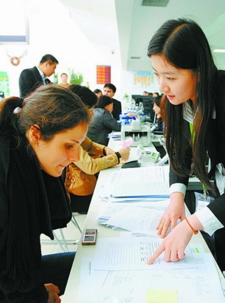 上图:上海世博会参展者服务大厅员工朱夏菁(右)正在与来自意大利的参展商(左)交流。