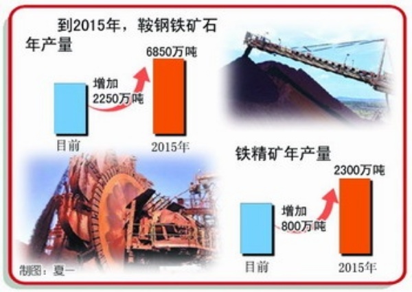 近日,工业和信息化部正式批准鞍钢老区铁矿山改扩建规划项目。鞍钢通过前期建设产能的释放和新规划项目的实施,在补充老采区生产能力消失的前提下,到2015年,铁矿石年产量将达到6850万吨,铁精矿年产量将达到2300万吨以上,分别比现有规模增加2250万吨和800万吨。到2020年,铁矿石年产量将达到9200万吨,鞍钢自产铁矿将满足届时生产需求的75%以上。