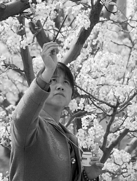 在河北泊头市一处梨园,果农为梨树授粉。近日,河北泊头25万亩梨花盛开,因梨花花期只有一周左右,果农们忙着为梨树人工授粉,以保证梨果产量。 新华社记者 巩志宏摄