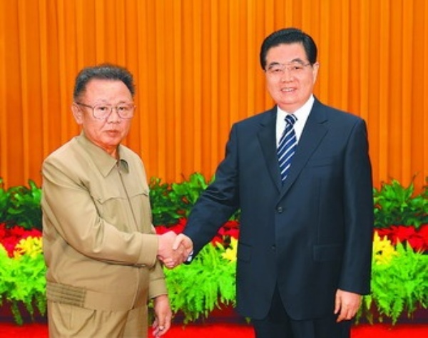 上图:5月5日,中共中央总书记、国家主席胡锦涛在北京人民大会堂与朝鲜劳动党总书记、国防委员会委员长金正日举行会谈。 新华社记者 兰红光摄