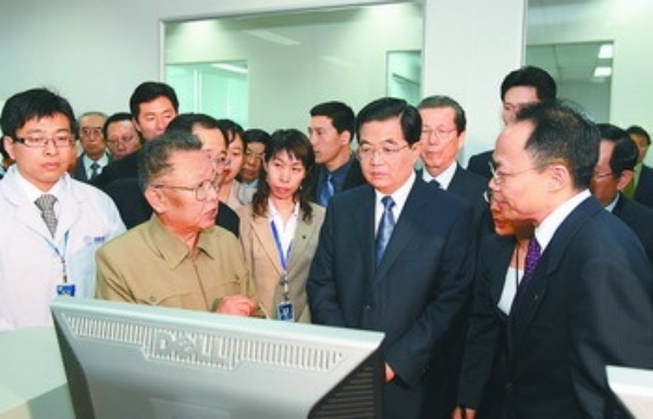 下图:5月6日,中共中央总书记、国家主席胡锦涛陪同朝鲜劳动党总书记、国防委员会委员长金正日参观北京博奥生物有限公司。 新华社记者 马占成摄