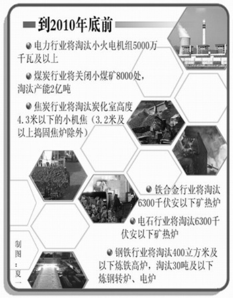 但是,由于长期积累的结构性矛盾比较突出,工业领域特别是一些高消耗、高排放行业,落后产能比重较大,淘汰落后产能的任务仍很艰巨。因此,《通知》以九大行业为重点,提出了近期重点行业淘汰落后产能的具体目标任务:在2010年底前,电力行业将淘汰小火电机组5000万千瓦及以上;煤炭行业将关闭不具备安全生产条件、不符合产业政策、浪费资源、污染环境的小煤矿8000处,淘汰产能2亿吨;焦炭行业将淘汰炭化室高度4.3米以下的小机焦(3.2米及以上捣固焦炉除外);铁合金行业将淘汰6300千伏安以下矿热炉;电石行业将淘汰6300千伏安以下矿热炉;钢铁行业将淘汰400立方米及以下炼铁高炉,淘汰30吨及以下炼钢转炉、电炉。