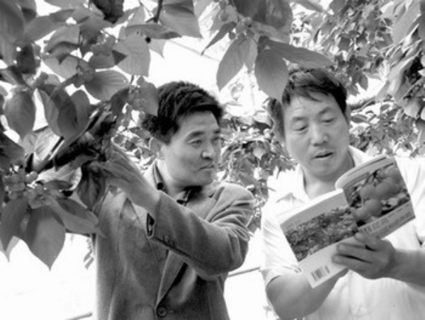山东省枣庄市水泉镇张山头村农民李秀剑(左)、张绍发(右)对照科技图书探讨樱桃管理技术。今年3月起,山东省枣庄市山亭区水泉镇张山头村以农家书屋为依托,鼓励农户以家庭图书、资金等形式入股,成立村级图书流转合作社,实现全村图书资源的共享。 刘明祥摄(新华社发)