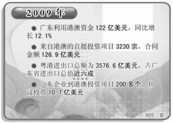 令人欣慰的是,2009年粤港共同应对国际金融危机,经贸合作逆势上涨,粤港进出口总额为3576.6亿美元,占广东省进出口总值近六成。广东企业到港澳投资项目200多个,协议投资10.7亿美元。2009年粤港经贸交流会签约金额近80亿美元。