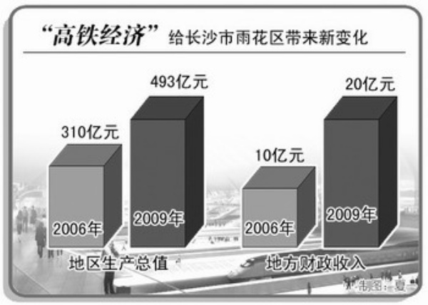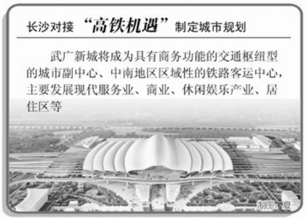 武广高铁开通,使雨花区的交通格局突破长沙概念,突破长株潭的概念,实现了与广州、武汉等大都市的高速对接。周杏武说,武广客运长沙南站的建成,将使长沙迅速升级为中部地区的重要交通枢纽,而武广新城也将迅速升级为这一枢纽的门户,成为大长沙发展布局的重要一极。