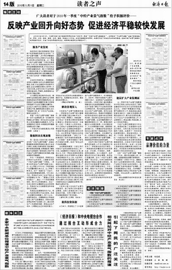 4月20日至5月5日,《经济日报》和中国经济网同时刊发了2010年一季度“中经产业景气指数报告”,本季度的“产业景气指数”涵盖了装备制造业、家电、石化、纺织、煤炭、水泥、钢铁、乳制品八个行业。在发布指数报告的同时,本报还刊发了对相关行业的延伸报道。这组中经产业景气指数和延伸报道刊发后,引起了社会各界读者的关注,现将部分读者的点评摘发如下。