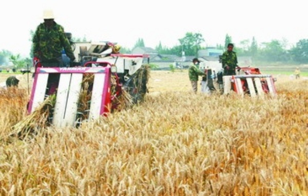 5月11日,在四川省眉山市彭山县谢家镇成片的麦田里,来自河南的“麦客”驾着收割机帮助农民抢收小麦。 今年前期遭受旱灾的眉山市,由于及时组织群众抗旱和加强小麦后期管理,全市110多万亩小麦旱灾之年喜获丰收。目前该市正全力组织收割,确保小麦颗粒归仓。 姚永亮摄(新华社发)