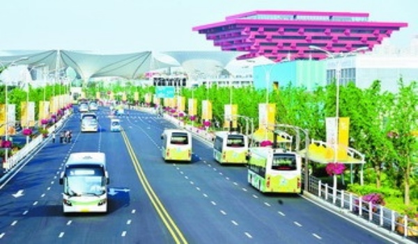 5月11日,电动车和电容公交车行驶在世博园区。上海世博会期间,电容公交车和电动车往来于浦东和浦西园区之间接送中外游客。世博园区配备1000多个电池箱以及电容公交车充电设施,以保证这些电力公共交通正常运转,实现园区车辆无污染零排放。 吴宣述摄(新华社发)