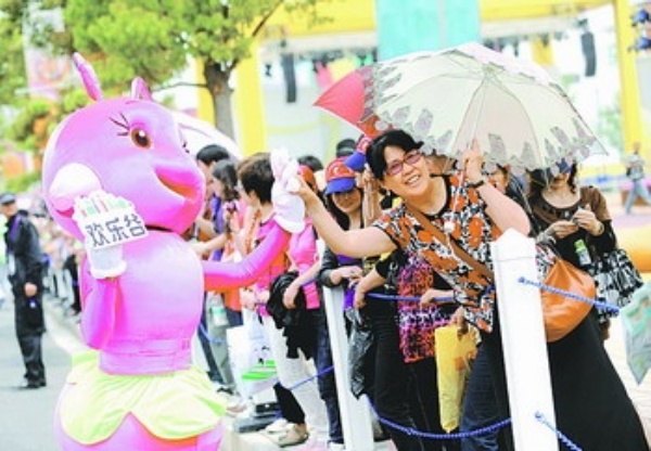 ▲北京周活动期间,花车巡游表演中憨态可掬的卡通形象受到游客的喜爱。