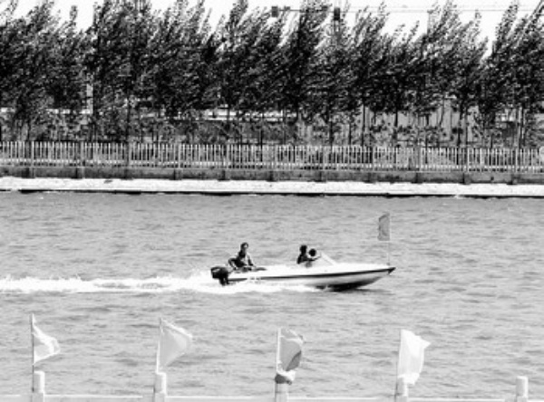 5月10日,湿地管理者在天津武清区大黄堡燕王湖生态旅游岛检查水面。