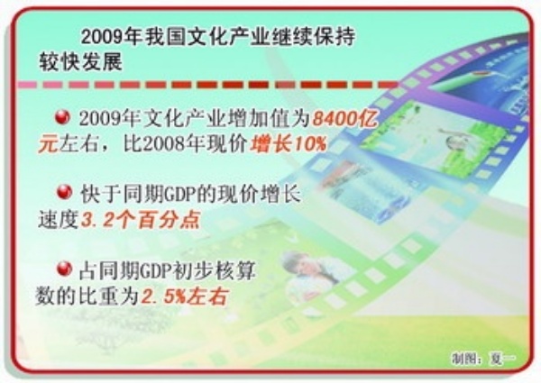 最新资料显示,2009年我国文化产业继续保持较快发展。国家统计局根据相关资料初步估算,2009年文化产业增加值为8400亿元左右,比2008年现价增长10%,快于同期GDP的现价增长速度3.2个百分点,占同期GDP初步核算数的比重为2.5%左右。