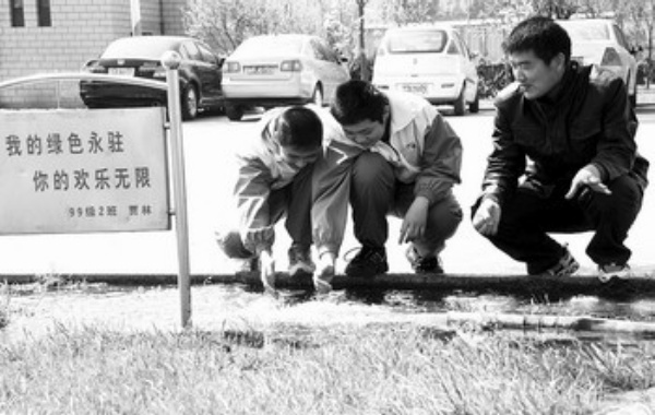 上图:山东省邹平县实验中学学生开展校园生活废水循环再利用课题研究。图为师生利用生活废水浇灌草坪。