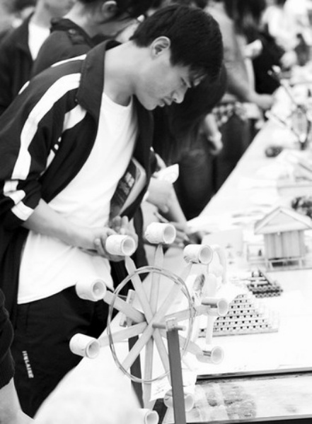 下图:湖北省宜昌市三峡大学的学生们发挥想象变废为“宝”,用报纸、废弃建材等废旧物品制作的100多件手工作品亮相。图为大学生欣赏用废旧物品制作的手工作品。