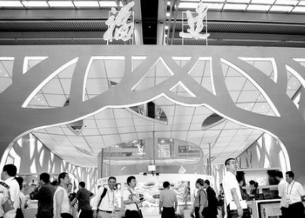 在第六届文博会上,以榕树为核心元素,外形又有船舰模样的福建展馆吸引了众多参观者。该馆的总体创意是以“山”作为展馆设计理念,森林的造型突出福建在全国森林覆盖率最高的特点,同时设计倡导低碳、寓意和谐发展。 本报记者 杨阳腾摄影报道