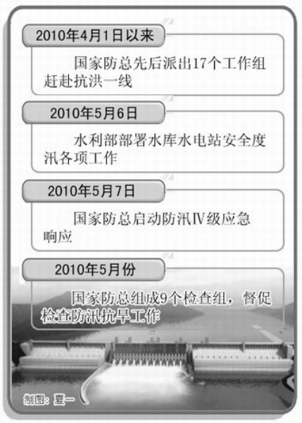 5月6日,水利部部长陈雷主持召开全国水库安全度汛视频会议,部署水库水电站安全度汛各项工作;5月7日,国家防总启动防汛Ⅳ级应急响应,4月1日以来先后派出17个工作组赶赴抗洪一线,协助地方抢险救灾;5月份,国家防总组成9个检查组,分赴大江大河和重点地区督促检查防汛抗旱工作;组织制定了《防汛抗旱检查规定》《国家防总工作组管理规定》等规章制度,修订大江大河防御洪水和洪水调度方案;组织全国山洪灾害防治试点项目验收,对山洪灾害防御工作进行了专题部署;组织进行防汛物资的更新和储备,加强机动抢险队建设……