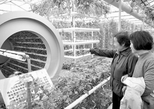 参观者在观看滚筒栽种模式培育的蔬菜。在第11届中国(寿光)国际蔬菜科技博览会上,诸多新颖的蔬菜种植技术让人耳目一新。 新华社记者 朱 峥摄