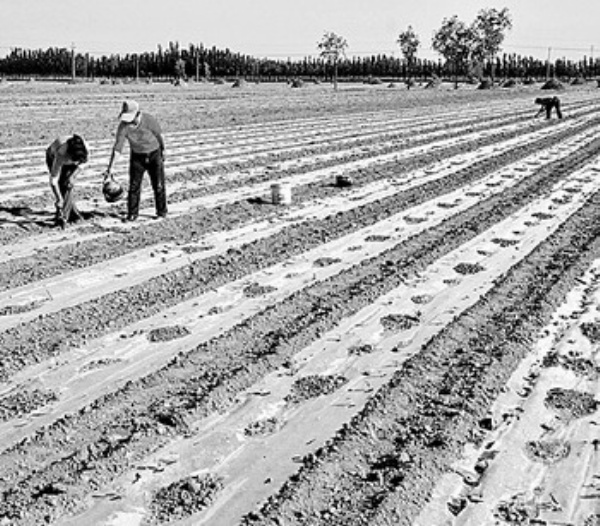 河北省新河县东千村农民在田间补种棉花。 河北省春播幼苗正值初期管理阶段,农民开始适时给幼苗浇水、施肥、除草,加强田间管理,促进春苗茁壮生长。 新华社记者 杨世尧摄
