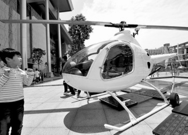 4月24日,第二届中国(深圳)国际工业博览会在深圳华南城开幕。图为一位小朋友被西安西捷飞机有限公司生产的一架轻型直升机吸引。
