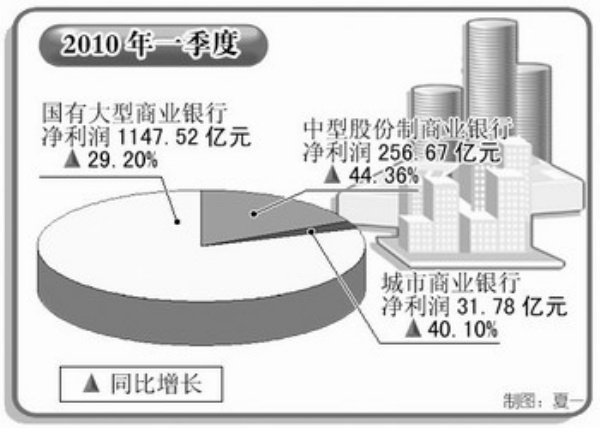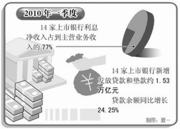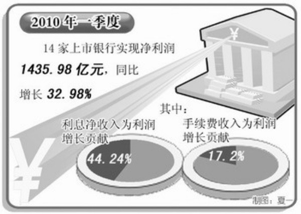2010年一季度,14家上市银行实现净利润1435.98亿元,同比增长32.98%,商业银行利润增长的态势明显。一季报显示,14家上市银行利润增长的主要贡献因素是利息净收入和手续费及佣金净收入,分别为利润增长贡献了44.24%和17.20%。