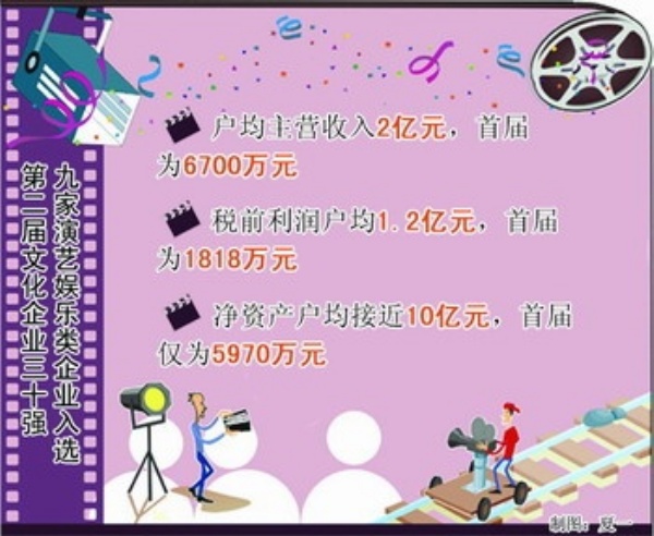 在近日揭晓的第二届文化企业30强榜单中,演艺娱乐类入选企业共9家。相关数据显示,自2008年评选首届文化企业30强以来,演艺娱乐类企业在文化产业核心层3大门类中增幅最快。9家企业户均主营收入为2亿元,首届为6700万元;税前利润户均1.2亿元,首届为1818万元;净资产户均接近10亿元,首届仅为5970万元。