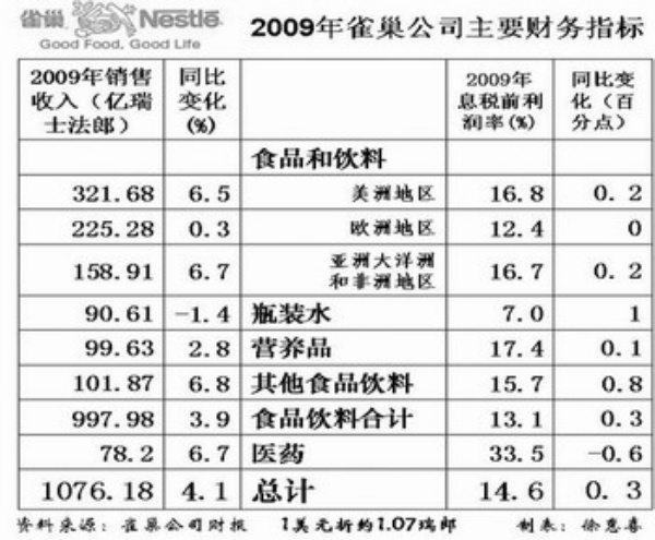 四、重视新兴经济体市场。雀巢集团首席执行官保罗·巴尔克接受本报记者采访时表示,2009年度雀巢在中国的年销售额创历史纪录地达到23亿瑞士法郎,与上年同期相比继续保持了两位数的增长,实际增长率高达25%,远远超过雀巢在全球各大市场的平均增长率。他说,从雀巢于1908年在上海设立销售办公室以来,中国市场对雀巢一直具有巨大的吸引力,特别是最近30年,雀巢已在中国广东、天津、黑龙江、云南、内蒙古、北京等地建立了23家食品加工企业及部分原材料生产基地,2008年雀巢还在北京建立了研发中心,目前雀巢在华员工已经超过13000余人。巴尔克表示,在未来10年,雀巢整个集团年度销售总额的45%将来自新兴经济体市场,老年群体营养食品将成为雀巢新的增长点。